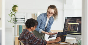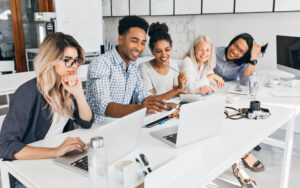 Five young adults stand together in a bright office, smiling and posing with arms around each other. They wear casual clothes, some holding laptops, looking happy and friendly.
